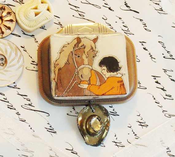 | Cowgirl Dreams Vintage Assemblage Pin from Stories Divinations – The artist uses a 1930s image to create a sweet horse-themed pin. Tell a story and receive a 20% discount! |