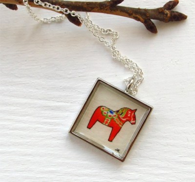 | Hand Painted Necklace featuring a Red Swedish Dala Horse by Sarah-Lambert Cook |