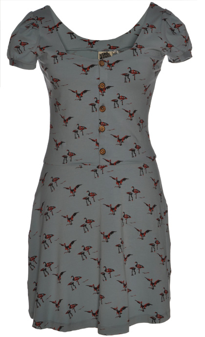 | Jodie Dress by Nancy Dee – Organic cotton paired with a fun flamingo print. Quirky dress made under ethical conditions in India using environmentally friendly processes |
