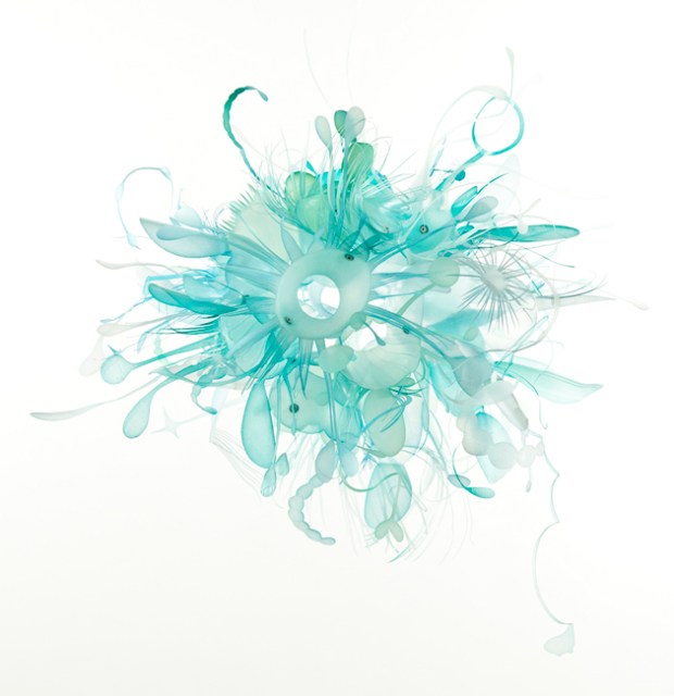 | “Kermit” – This ethereal artwork was constructed from plastic debris (PET), rivets, tinted polycrylic and mica powder |