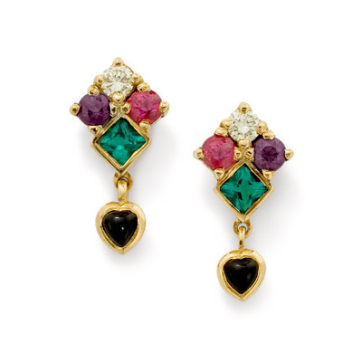 “In Our Hearts – Earrings” – Lusciously romantic earrings with a special selection of gemstones which cheekily spell out LOVER: Lemon diamond, Opaque jasper, Violet spinnel, Emerald and Ruby