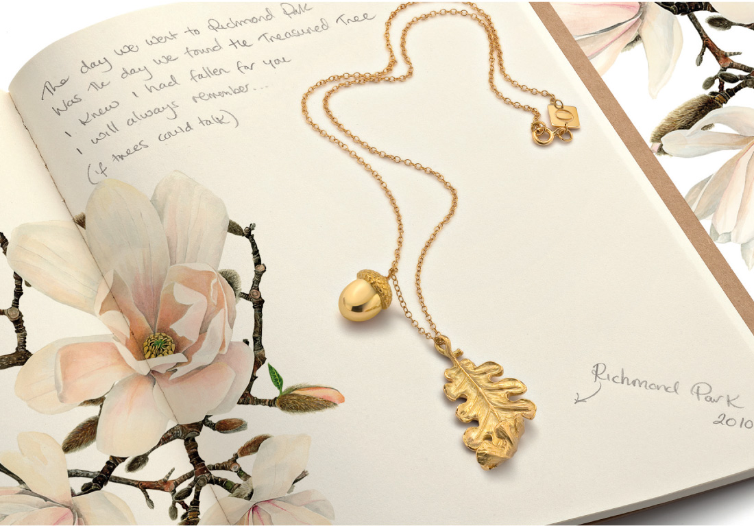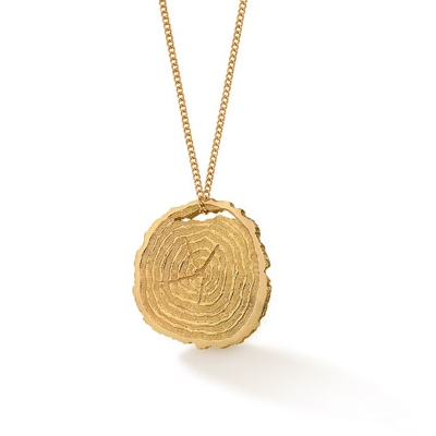 “If Trees Could Talk” – Hand-carved slice of oak in 18ct fairtrade gold. Wonderfully unique!