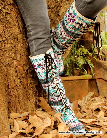 | Anja Boots in Blue Birds made from recycled Hmong embroidery and batik by Siamese Dream Design |