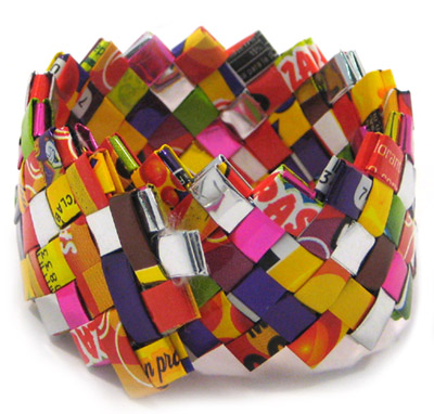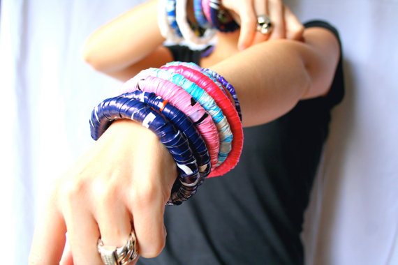| Big Recycled Plastic Bag Bracelets by Factory on the Moon – These remind me of the lolly string bracelets we had back in the day. What a fabulous use for plastic bags! |