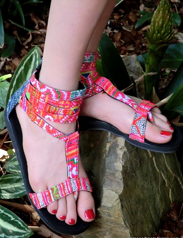 | The Cassandra Gladiator Sandals from Siamese Dream Design – This lolly-like footwear has been crafted from repurposed Hmong embroidered and batik skirts |
