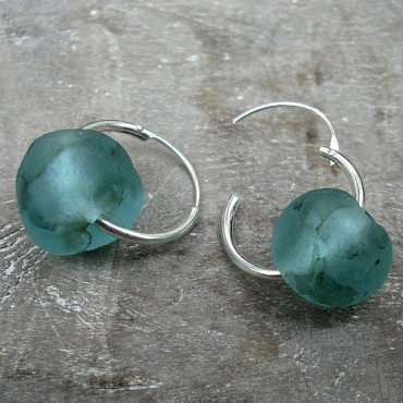 | Recycled Glass and Silver Hoop Earrings by Beaucoco – These enchanting earrings remind me of bottles washed ashore with a scrolled letter loving tucked inside. The glass for these earrings has been gathered from all over West Africa and individually reformed using clay moulds fired in an earth kiln |