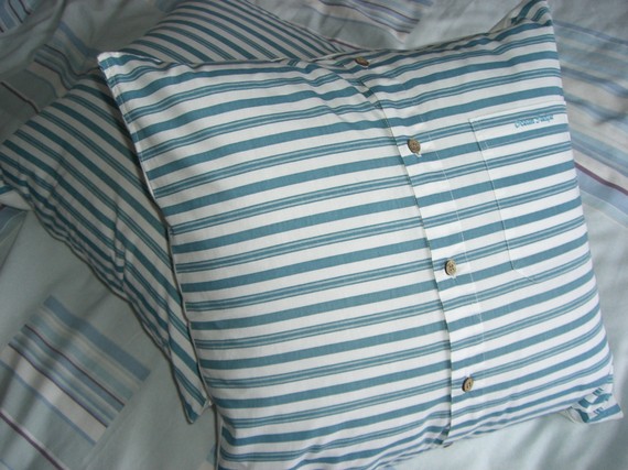 | Pair of Stuffed Shirt Stripey Ocean Pacific Yacht Caravan Cushion Covers by Leslie Works – These fantastic sea-faring cushions have been crafted from upcycled 2nd hand shirts! |