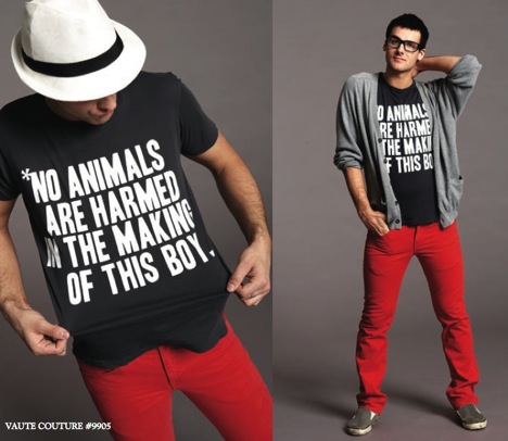 | No Animals Harmed Tee by Vaute Couture – Nothing’s sexier than a man who is kind to animals! This disclaimer tee is 100% certified organic cotton and fair trade to boot |
