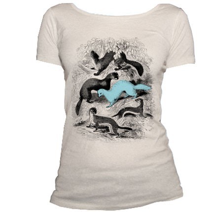 | Blue Rinse Weasel Scoop Neck Tee by Look For Fiddleheads – The designer was inspired by the weasel’s fabled ability to “see all things in the dark and hear all things with their little pointed ears. They know so much in their silence”. The original print is from a rare early 19th century newspaper belonging to the designer’s grandmother. This 100% organic cotton tee is also 100% quirky-chic! |