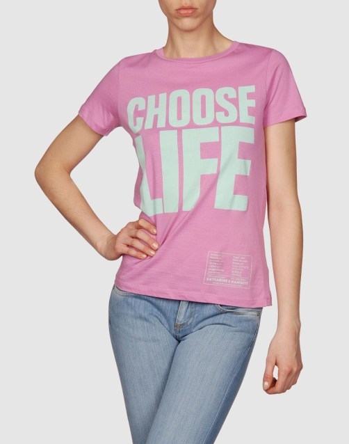 | CHOOSE LIFE Tee by Katharine Hamnett – This iconic 80s slogan tee once worn by George Michael was first seen in a Buddhist exhibition that Lynne Franks, of Ab Fab fame, hosted. The designer proclaims; CHOOSE LIFE over WAR on this organic cotton tee |