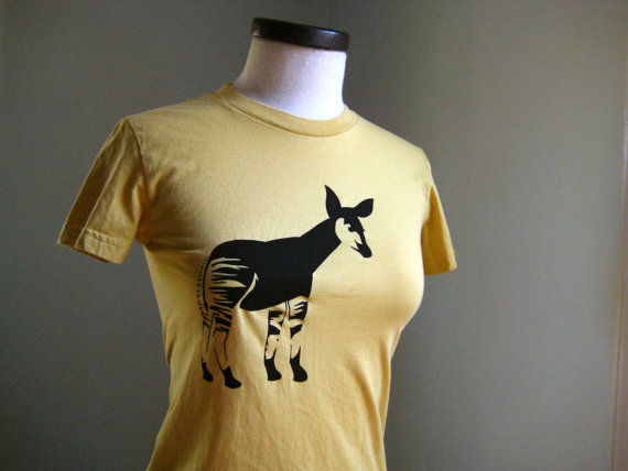 | Okapi T-Shirt by Seven Gill – This unusual yet captivating creature (pronounced oh-COP-ee) is the only living relative of the giraffe. You can now take home your very own organic cotton Okapi! |