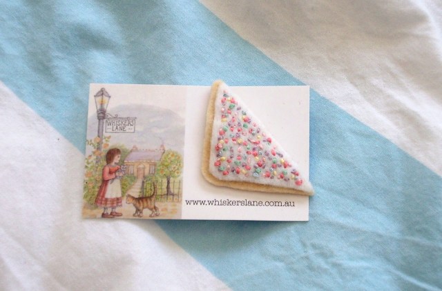| My fabulous friend and vintage aficionado Olivia Simmons gave me this BRILLIANT fairy-bread brooch by Whiskers Lane which is available at the amazing Sweets Workshop in Summer Hill, Sydney. Ps: Don’t you just love the Babushka bag it came in??? |