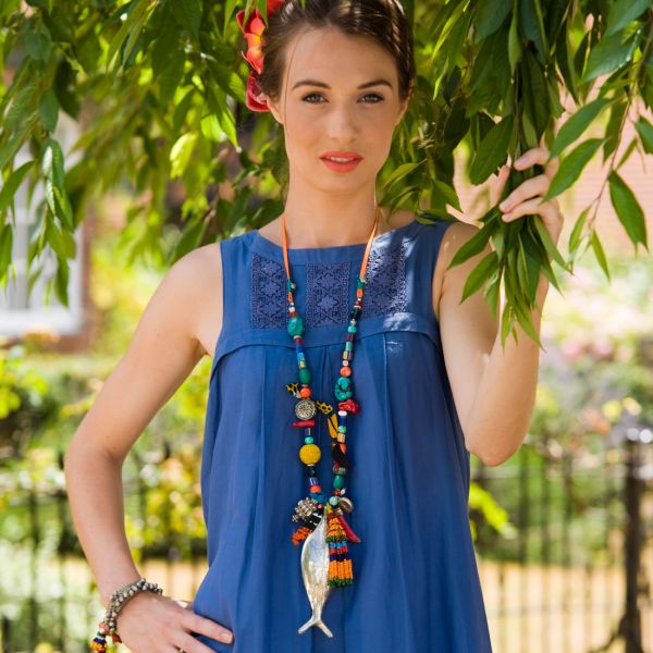 | African Trader Necklace by Sweetlime – This eclectic piece was inspired by a time when beads were used as currency. This handmade necklace features a Moroccan metal fish, Afghani tassel, Nepalese Beads, African trader glass beads, Indian metal bead, resin tusk and a painting of Hindu God – Shiva…AND it’s the only one of its kind! |