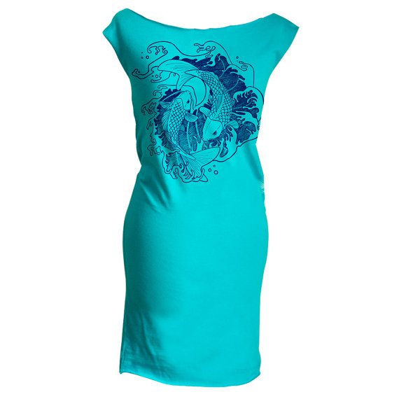 | Teal Fighting Japanese Koi Fish T-Shirt Dress by Yay for Fidget Art – I find the combination of this colour and the hand-printed artwork so striking. This dress looks super comfy too! |