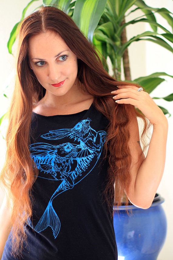 | Mer-rabbit T-Shirt Dress by NY Hop – Only the very fortunate catch a glimpse of this extremely rare species of fish, which is part rabbit and part seahorse ;o) The image of these graceful creatures has been screen-printed with eco-friendly, water-based fabric inks |