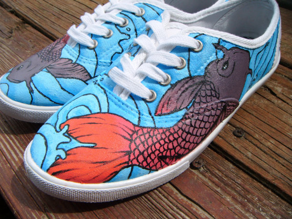 | Koi Fish Shoes by Deanna Weibel – Send your fair-trade, eco-friendly vegan shoes to Deanna and she’ll pretty them up for you with her paintbrush! |