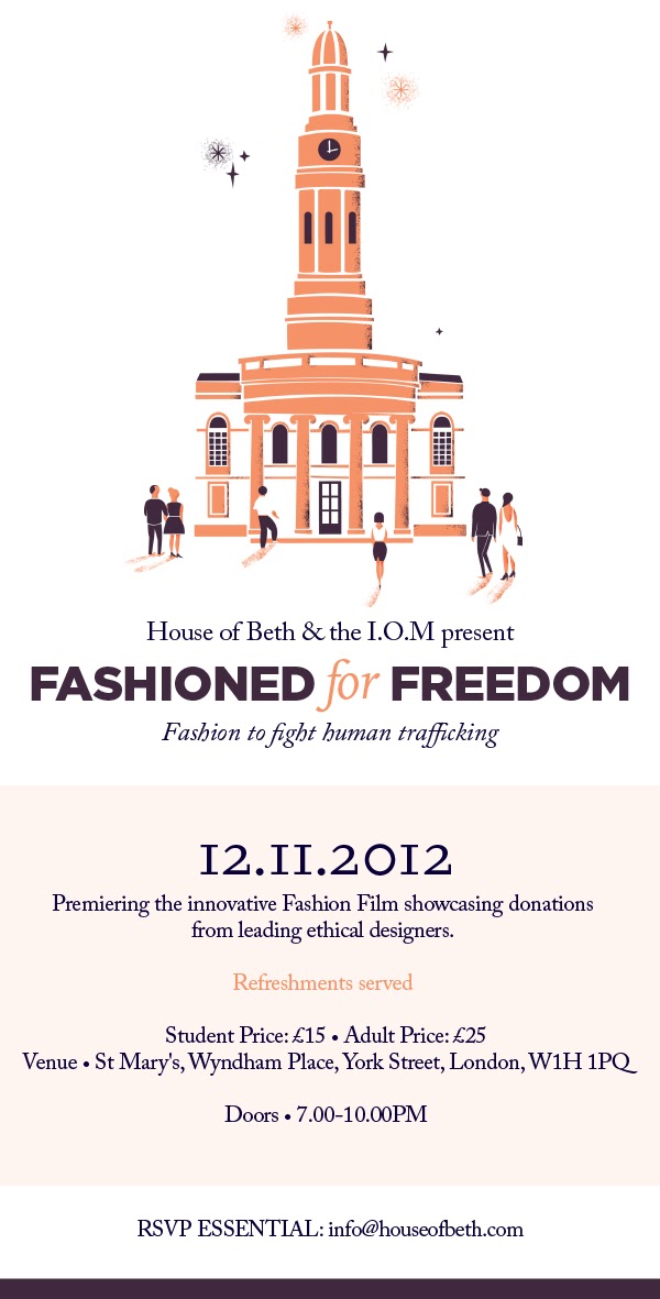 We are very excited about our big event on November 12th, Fashioned For Freedom. We are working with the International Organisation of Migration on the event to raise money for the survivors of trafficking and media partnering with Slink Magazine